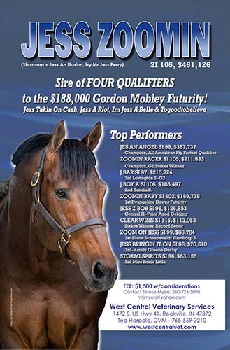 ZOOM ON JESS SI 99, g. Feature Miss Fame by Feature Mr Jess (8 wins to 3, $83,784 1st-Blane Schvaneveldt Handicap S., 1st-The Plan H., 1st-Bitterroot Derby [R] , 1st- Idaho Cup Futurity, etc.)